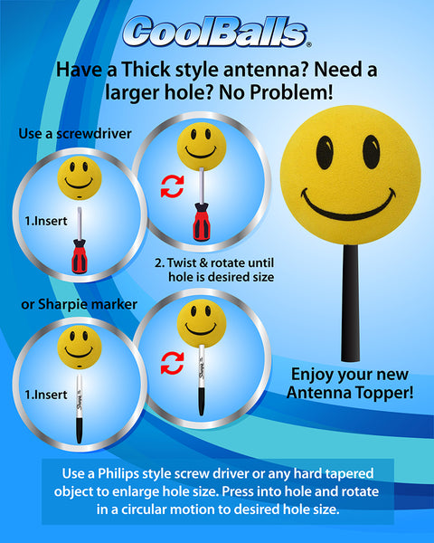 ** Have a fat antenna? No worries. Enlarge hole diameter with Phillips style screw driver or smooth end of a large sharpie marker